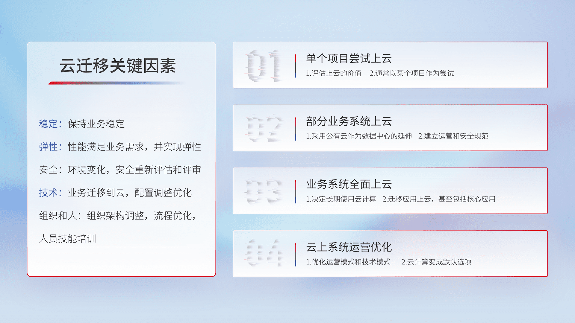 结合实际业务,,从规划设计、、、、云平台选型、、云原生改造、、、数据迁移、、、集成交付,,,迁移全过程为客户识别最佳上云路径,,做好风险识别管理,,,,设计网络架构、、身份权限、、、、安全审计合规、、、操作审计、、日志审计、、、、监控告警策略、、、多站点容灾设计等,,对云上基础设施进行整体规划,,,提升IT治理水平,,以满足弹性、、、高可用、、、高性能的需求。。。